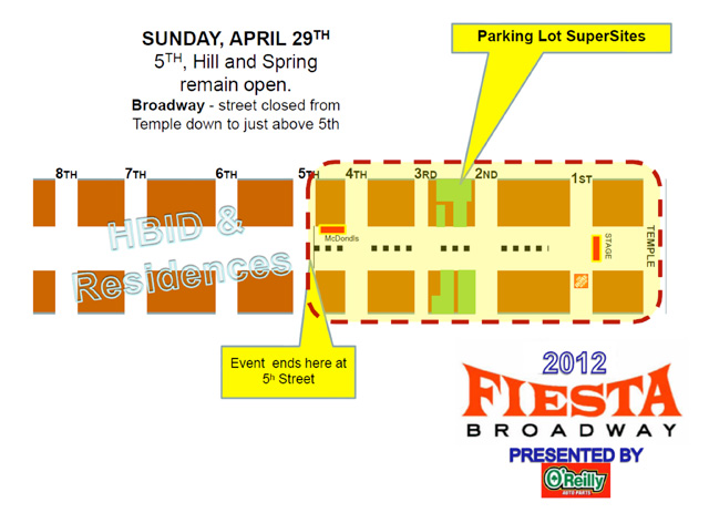 The 23rd Annual Fiesta Broadway Presented by O’Reilly Auto Parts Event will be held on Sunday, April 29th 2012. Temporary Street Closures on Broadway between 1st and 5th starting on Saturday, April 28th until Monday, April 30th 5am.
