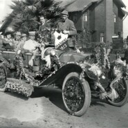 Started by the Valley Hunt Club in 1890 to celebrate California’s mild winter weather, the parade was so large that the Tournament of Roses Association took over the organizing and running in 1895. To help pay for it, the Rose Bowl football game was added in 1902. The parade has always proceeded down Orange Grove Boulevard to Colorado Boulevard, and the route has been increased drastically since its beginning. The early years featured carriages decorated with flowers, horse patrols with flowers, and even early automobiles festooned with colorful blooms. The 1913 parade included such entrants as the Pasadena Municipal Band, Pasadena Board of Trade, Royal Rosarians, Melting Pot of the Nations, Michelin float, an electric car, Auto Accessory Dealers, the Elks, Campfire Girls, Boy Scouts, Cawston Ostrich Farm, Humane Society, YMCA, the Los Angeles Times, and cities like Venice, Santa Monica, Redondo Beach, Huntington Beach, San Diego, Alhambra, and the San Fernando Valley. The Los Angeles Chamber of Commerce float won first prize in Class A, a realistic steamer ship which spouted “steam” and pelted onlookers with flowers.