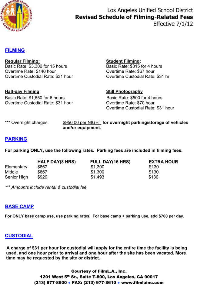 The Los Angeles Unified School District (LAUSD) has revised its schedule of fees to film or park at District-owned locations. A copy of the revised fee schedule is attached to this Alert and will soon appear on FilmL.A.’s website. The new rates will take effect July 1, 2012. This will be LAUSD’s first fee increase in years.